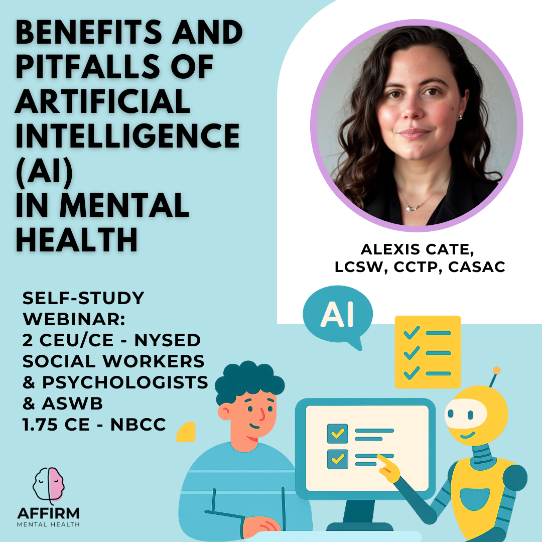 In this prerecorded webinar, Benefits & Pitfalls: Artificial Intelligence & Mental Health Care explores the transformative role of artificial intelligence (AI) in the mental health field. Instructor Alexis Cate examines both the capabilities and limitations of AI, highlighting its potential benefits while critically addressing the ethical implications and challenges it introduces to clinical practice.