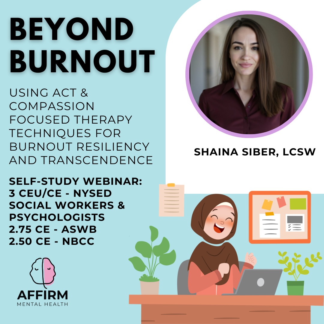 This prerecorded webinar, led by Shaina Siber-Sanderowitz, LCSW, offers a comprehensive exploration of burnout and equips participants with practical strategies to cultivate resilience and transcend burnout—both for their clients and themselves. In today’s fast-paced world, burnout is increasingly prevalent across professions. Drawing from evidence-based, third-wave CBT techniques, this webinar introduces the Beyond Burnout Blueprint, a framework of six key strategies for navigating and overcoming burnout.