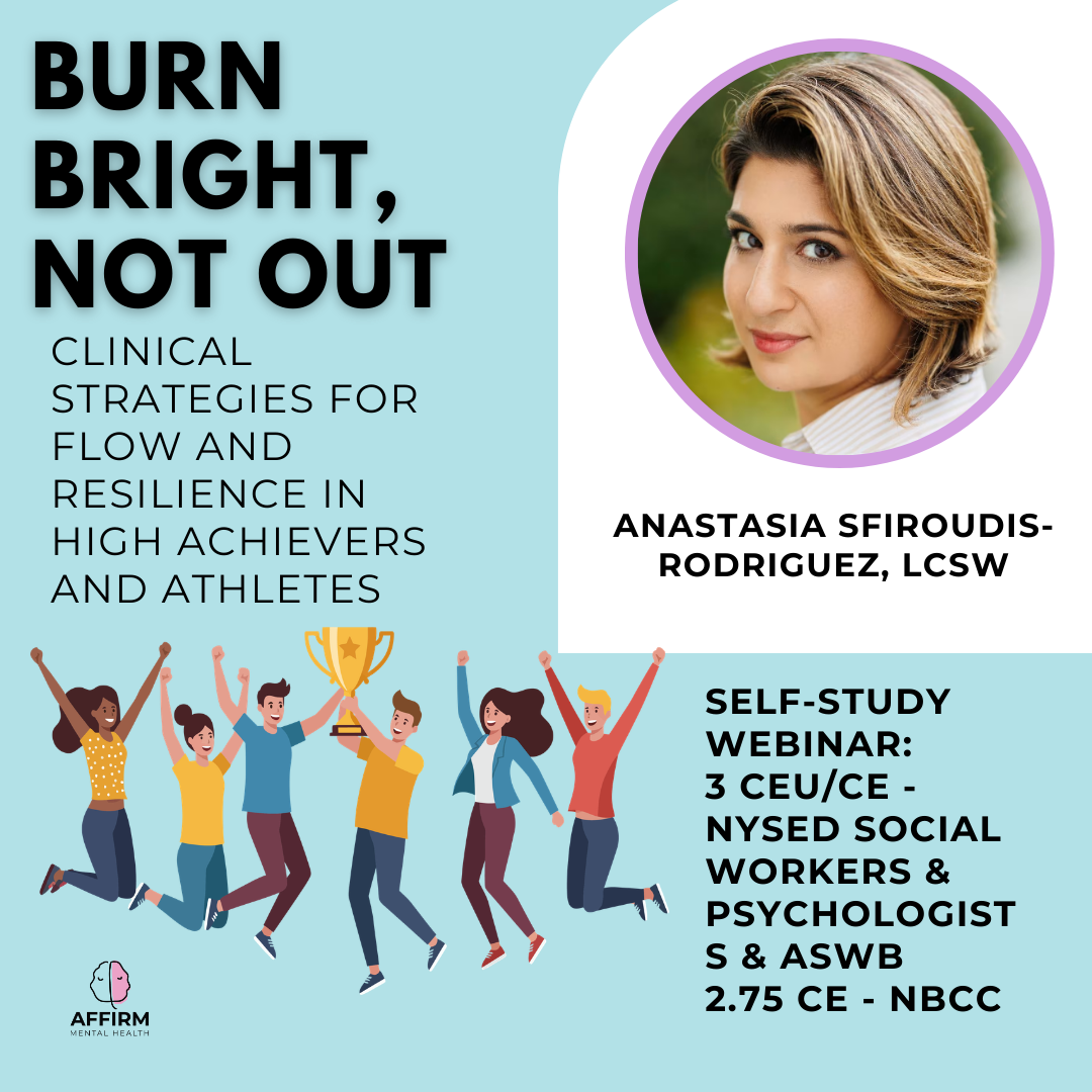 In this prerecorded webinar, you'll explore the intricate relationship between flow and burnout, gaining practical strategies to help high-achieving clients sustain peak performance while supporting their mental well-being. This engaging training examines how unrelenting standards contribute to cognitive fusion, reduced resilience, and burnout, ultimately hindering psychological flexibility. Through evidence-based Acceptance and Commitment Therapy (ACT) interventions—including mindfulness practices, values-based action, and self-compassion techniques—you’ll walk away with actionable tools to promote sustainable flow and enhance psychological flexibility in high-performing clients.
