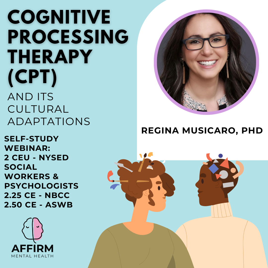 In this pre-recorded webinar, participants will gain an in-depth overview of Cognitive Processing Therapy (CPT), a gold-standard, evidence-based treatment for Post-Traumatic Stress Disorder (PTSD). Grounded in cognitive-behavioral principles, CPT helps individuals identify and challenge unhelpful trauma-related beliefs, fostering healthier thinking patterns and emotional regulation. This training covers key concepts like the impact of trauma on cognitive schemas, how maladaptive thoughts maintain PTSD symptoms, and the role of Socratic questioning in promoting cognitive change. The webinar also explores cultural adaptations of CPT to meet the needs of diverse populations, addressing issues such as instability, low literacy, stigma, and mistrust of medical systems, and providing trauma-informed, culturally responsive care.