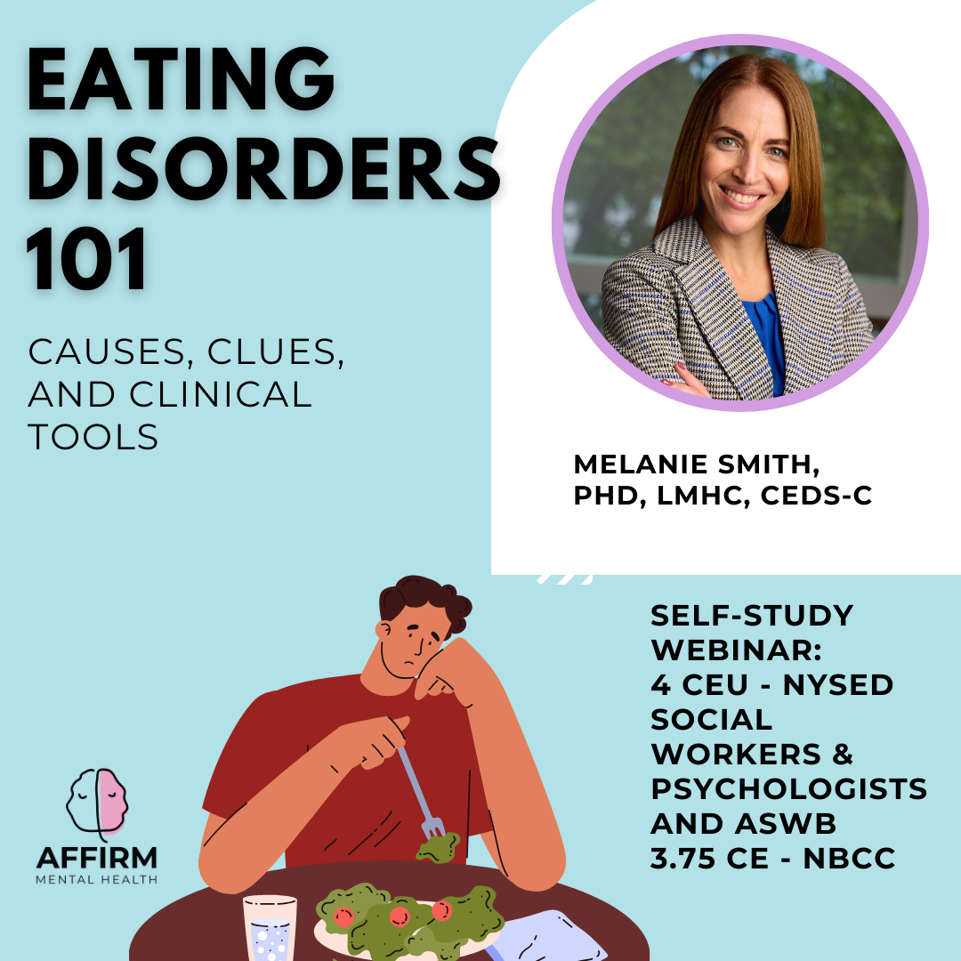 In this prerecorded webinar, you'll explore the complex and often misunderstood world of eating disorders. Designed to equip mental health professionals with essential tools and knowledge, this foundational training offers guidance on how to recognize, assess, and intervene effectively. Whether you're new to working with eating disorders or looking to refresh your skills, the course provides a comprehensive overview of underlying causes, diagnostic nuances, and treatment planning considerations to support ethical and affirming care.