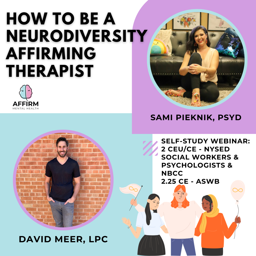 In this prerecorded webinar, we will explore a neurodiversity-affirming theoretical framework for therapeutic practice. Affirming therapists recognize neurodiversity as a natural and essential aspect of human variation, creating inclusive spaces that validate and advocate for marginalized individuals. Led by experts Dr. Sami Pieknik and David Meer, LPC, this webinar delves into holistic perspectives on behavior, integrating insights from diverse sciences to deepen our understanding of neurodiversity. Learn how to cultivate a clinical practice centered on therapeutic processes, empowering both clients and clinicians alike.
