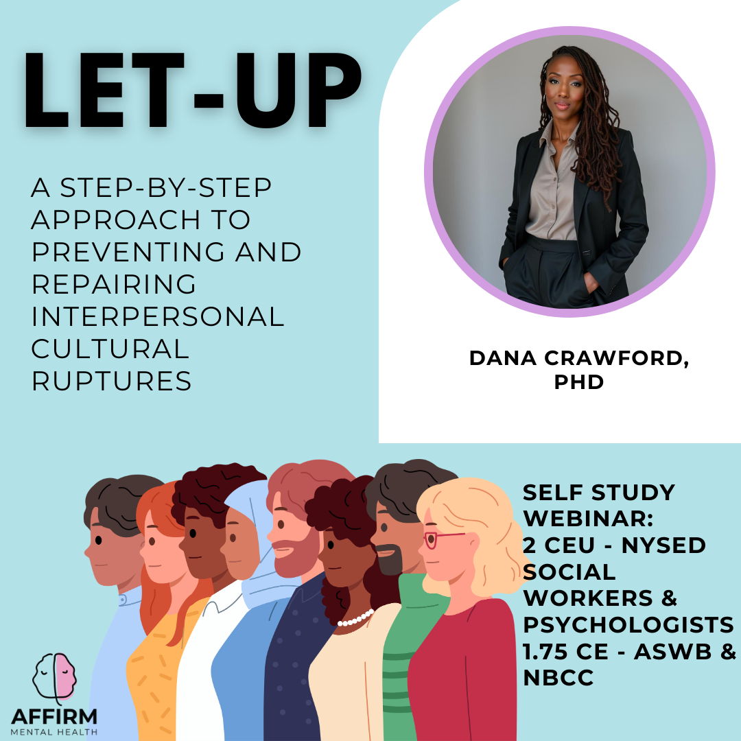 This prerecorded webinar, led by Dr. Dana Crawford, is designed for mental health professionals seeking to enhance cultural competence and advance equitable care in clinical settings. The workshop focuses on minimizing the impact of unconscious bias, developing effective strategies to address prejudice and discrimination, and fostering inclusive communication. Participants will gain practical insights and leave with a comprehensive toolkit to promote inclusivity and equity in their practice. Learn how to transition from reactive responses to strategic interventions using the LET-UP framework, equipping you to confidently navigate cultural challenges and build positive therapeutic relationships. Through simulated scenarios and guided exercises, refine your bias-reduction skills in a supportive learning environment.