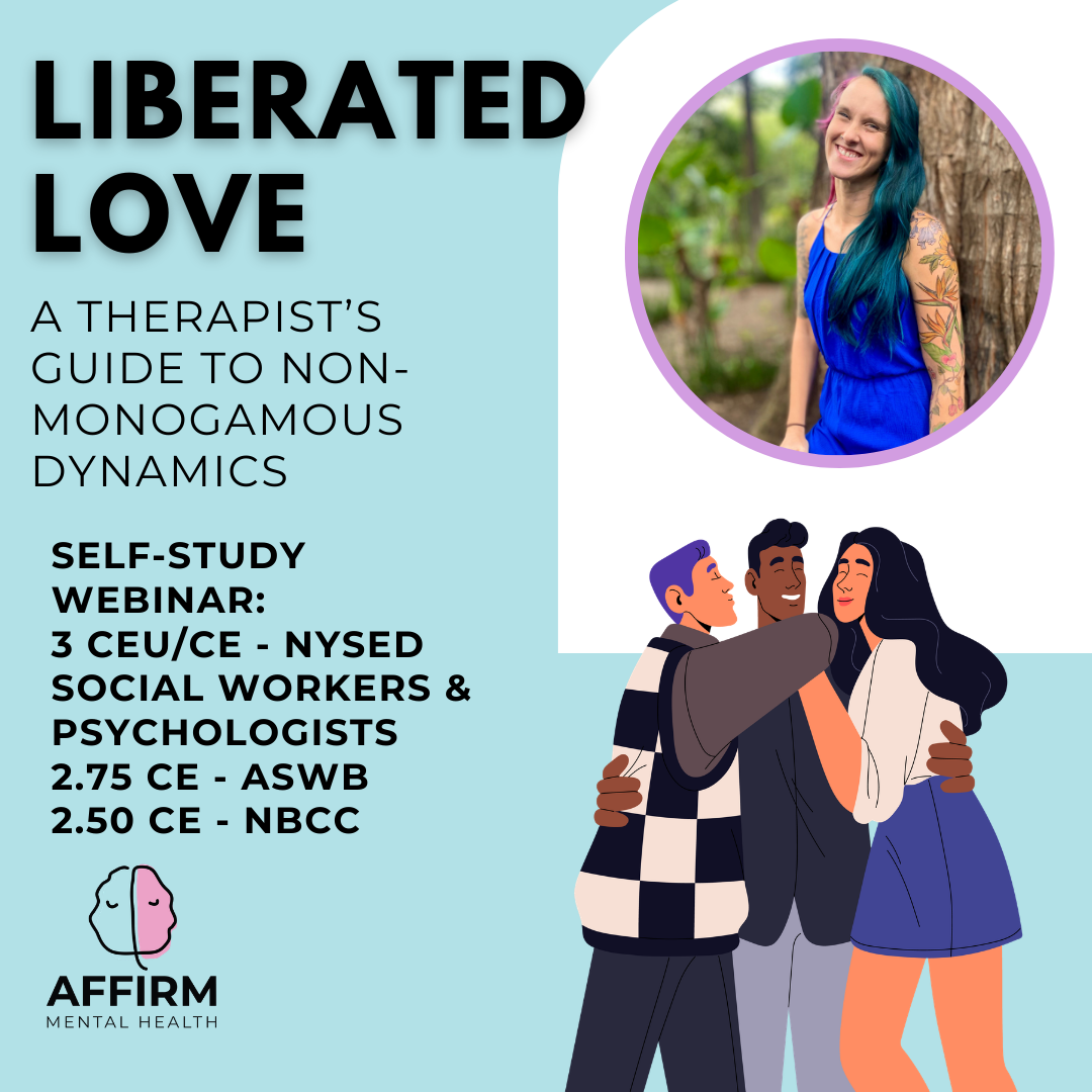 In this prerecorded webinar, you will enhance your therapeutic practice and deepen your ability to support non-monogamous clients in “Liberated Love: A Therapist's Guide to Non-Monogamous Dynamics.” This informative and interactive training is designed for clinicians seeking to expand their understanding of non-monogamy and cultivate more affirming, inclusive therapeutic spaces. Through engaging discussion, evidence-based insights, and practical experiential exercises, you’ll explore the motivations behind non-monogamous relationships, challenge common myths and biases, and learn effective interventions that foster open communication and healthy relational dynamics. By the end of this course, you will be equipped to create a more supportive and culturally responsive environment for non-monogamous clients—empowering them to navigate their relationships with confidence, clarity, and compassion.
