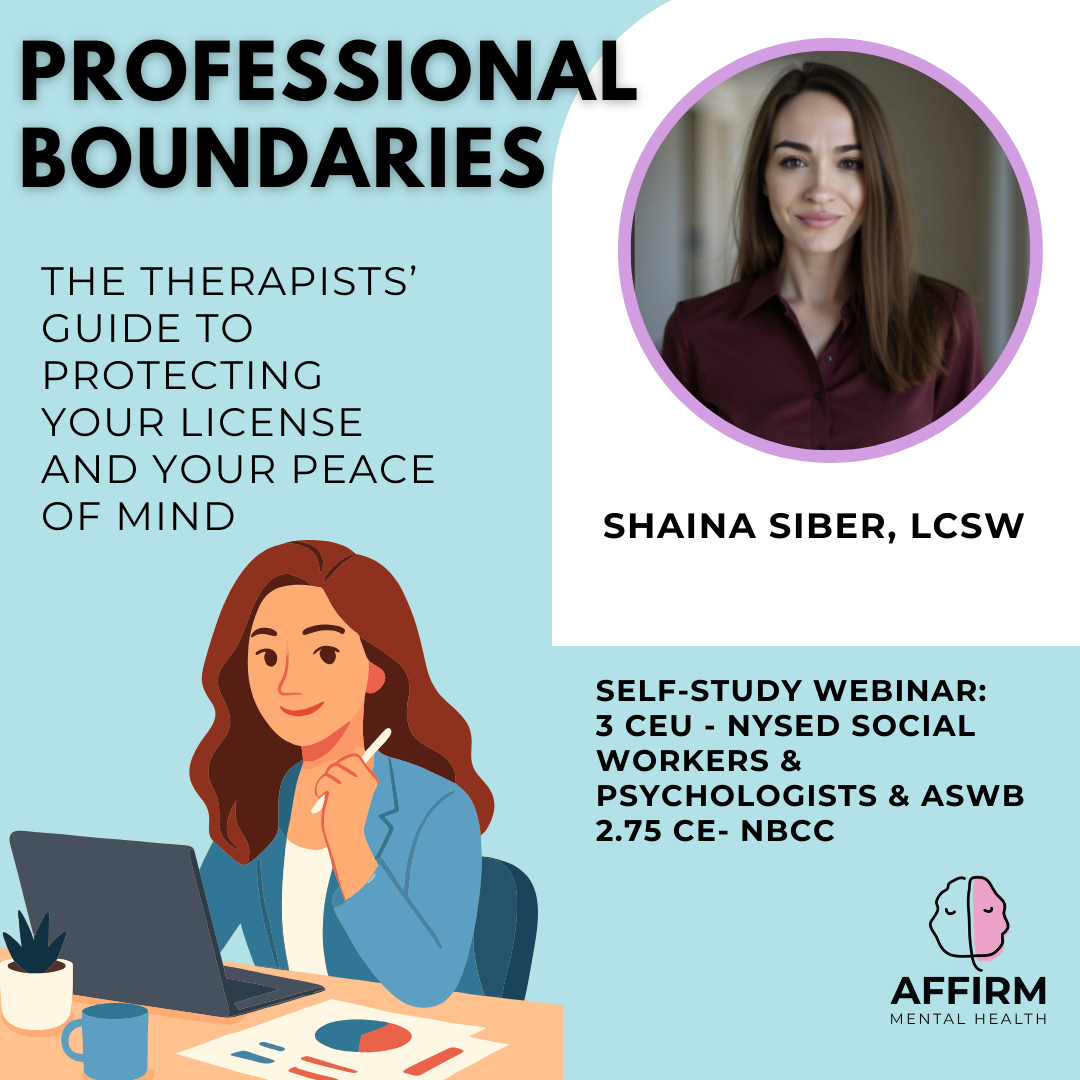 In this pre-recorded webinar, therapists will learn how to set and maintain professional boundaries in today’s rapidly changing landscape, including the rise of social media and artificial intelligence (AI). The webinar covers essential topics such as boundary setting in the digital age, avoiding violations that could lead to licensing board investigations, and resilience strategies to prevent burnout. Participants will gain practical tools for balancing professional and personal boundaries, handling complex client interactions, and navigating digital dilemmas. Real-life clinical vignettes and tools for safeguarding both your license and well-being are included, along with meeting the NYS-CEU requirement for Professional Boundaries for New York State Social Workers and Psychologists.
