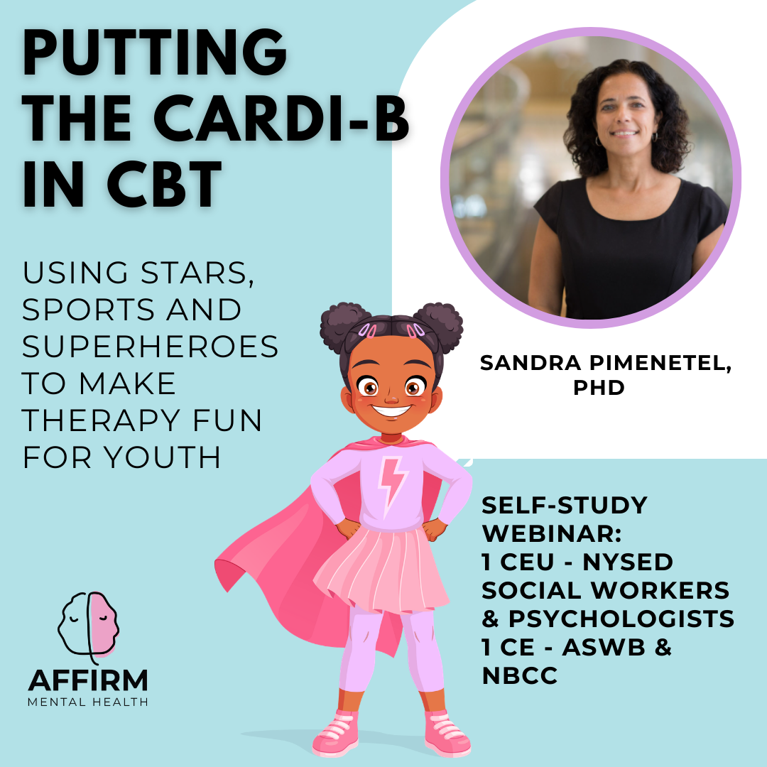In this prerecorded webinar, Sandra Pimentel, PhD, an expert in pediatric mood and anxiety disorders and emerging adulthood, teaches you how to infuse pop culture, storytelling, and other creative approaches into your clinical practice. Grounded in cognitive behavioral principles, this webinar provides therapists with evidence-based strategies to make treatment more effective and fun.