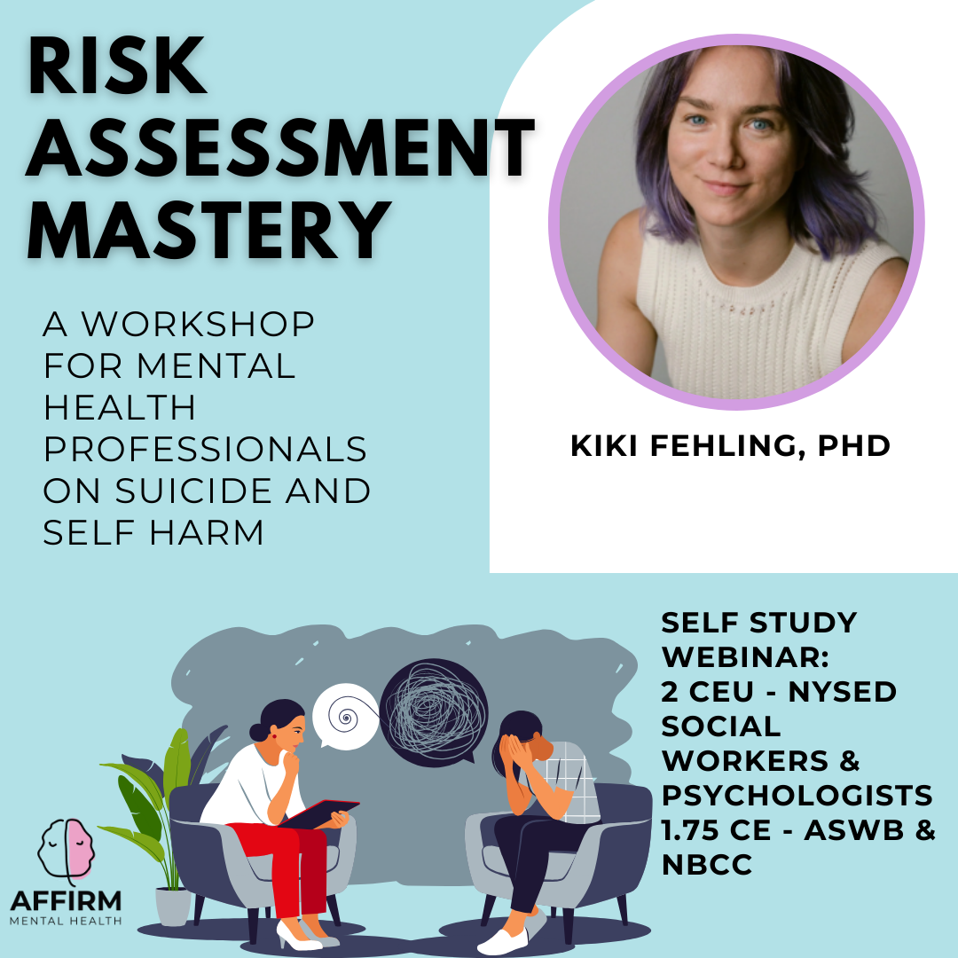 In this prerecorded webinar, attendees will gain valuable insights into evidence-based practices for assessing suicide risk. Dr. Kiki Fehling will review key terms related to suicidality, research on suicide risk factors, and essential considerations for intervention and documentation. Participants will learn to identify social, cultural, and general risk factors that influence suicide risk, as well as how to differentiate between non-suicidal self-injury, suicidal thoughts, and suicidal behaviors. Through didactic instruction and small group discussions on case examples, participants will deepen their understanding of how to support suicidal clients while balancing client autonomy with clinician responsibility.