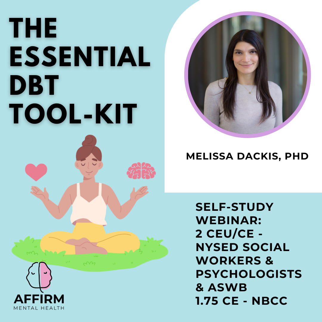 In this prerecorded webinar, learn from Melissa Dackis, PhD, a child and adolescent psychologist with expertise in Cognitive Behavioral Therapy, Dialectical Behavior Therapy (DBT), and mindfulness approaches. You will get an excellent overview of the DBT model and its evidence base. Learn essential DBT skills that you can incorporate into your clinical practice to support patients with distress tolerance, emotional regulation, and interpersonal effectiveness. This webinar is perfect for anyone seeking exposure to DBT or for those with intensive training who would like a refresher.