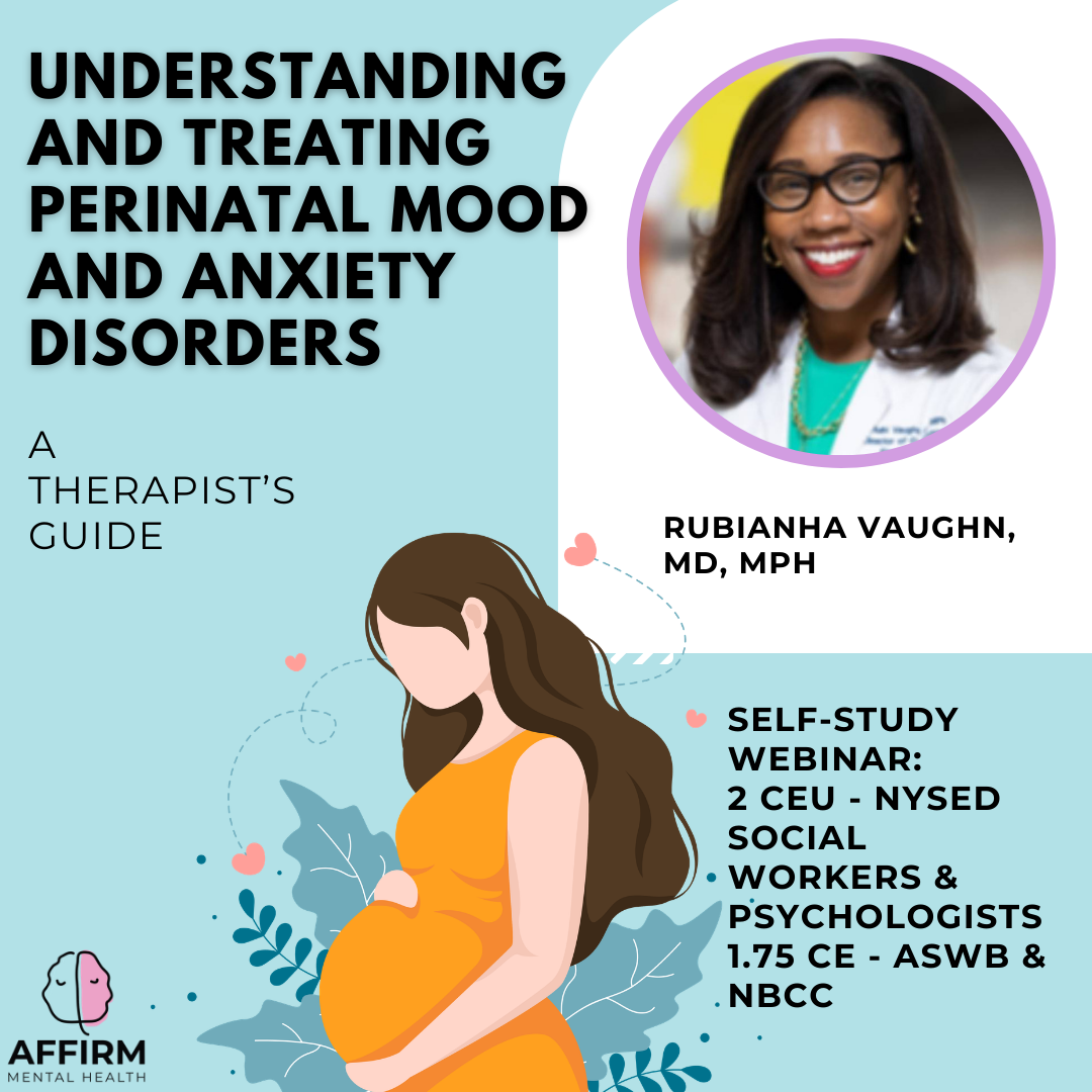 n this prerecorded webinar, learn from reproductive psychiatry expert Dr. Rubianha Vaughn about assessing, diagnosing, and treating perinatal mood and anxiety disorders. Gain an understanding of the most up-to-date, evidence-based research on medical and therapeutic interventions so you can fully support your clients in a variety of settings and help empower, advocate for, and educate patients.